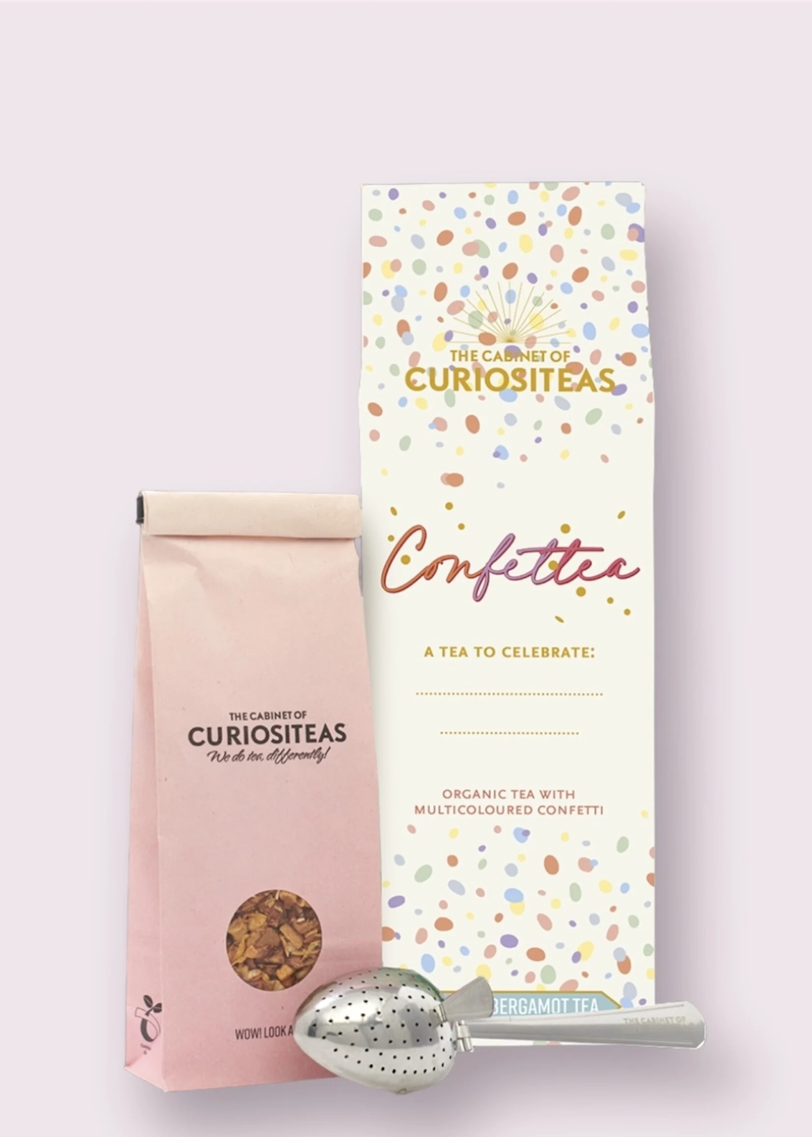 Confetti thee? Confettea! In deze thee vind je echte confetti, maar wees niet bang… hij lost gewoon op! In de giftbox zit ook een handige thee infuser.